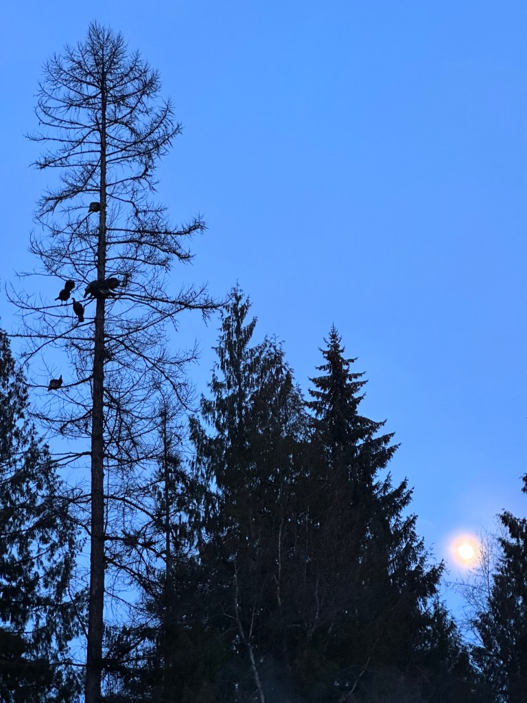 If I’m diligent, I’ll post pictures of what we see around the woods here. To start, here are a dozen wild turkeys, roosting high in a Tamarack as the full moon rises.