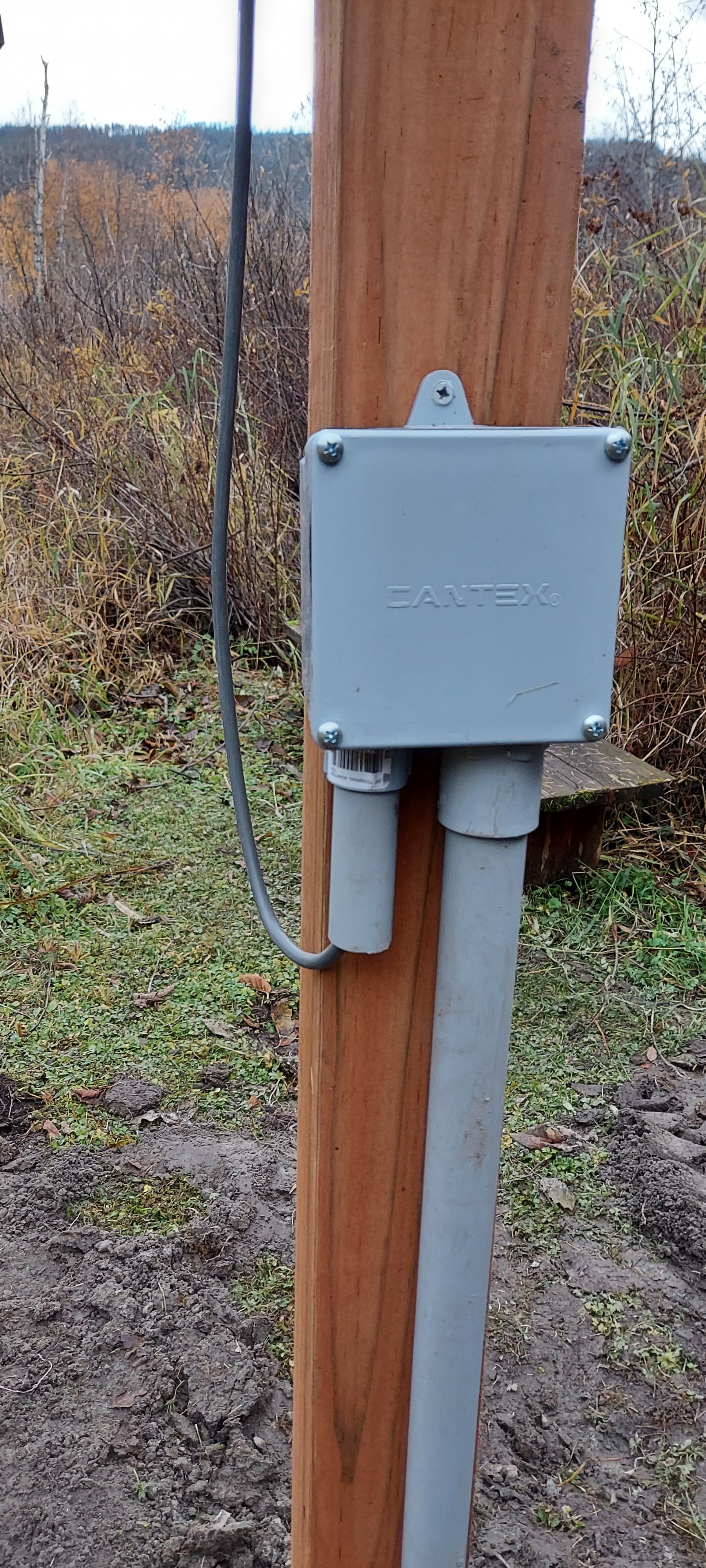 The choke on the Starlink cable will just barely fit in a 3/4 inch conduit, but won’t go around bends, so we ended up with 100 feet of 1″ and 200 feet of 3/4 inch conduit for the added CAT6 cable. 200 feet from the house, we added a post and used a surge protector, above ground, as a connector. This will allow us to pull the Starlink cable back out through the large conduit should we need to remove it for any reason.